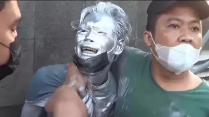 KM yang badannya disemprot cat warna perak (silver) sampai bagian wajah, mulai menangis. Warna perak di wajah KM pun luntur seiring tetesan air mata yang jatuh.