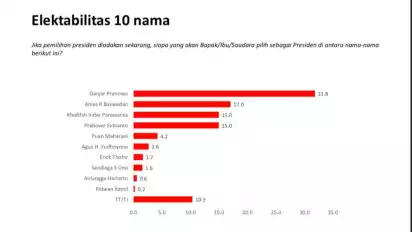 Ganjar berhasil meraih sebanyak 31,8 persen suara. Posisi kedua diduduki Anies dengan 17 persen. Sementara Khofifah dan Prabowo mendapatkan suara imbang dengan masing-masing 15 persen.