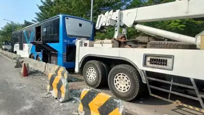 Bus Transjakarta Tabrak Separator Busway di Pluit Jakarta Utara