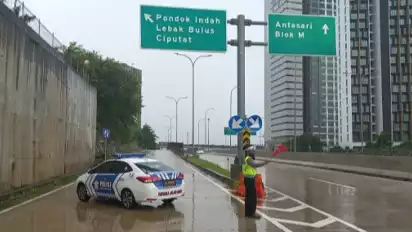 "16.03 Polri Dit Lantas PMJ melakukan pengalihan arus lalu lintas di Off Ramp Pondok Indah, imbas adanya genangan air di Jalur arteri mengarah Fatmawati Jakarta Selatan," tulis keterangan TMC Polda Metro Jaya, Kamis (6/10/2022). put