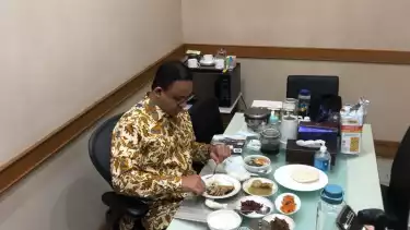 Jakarta - Gubernur DKI Jakarta Anies Baswedan menikmati makan siang terakhir di Balai Kota DKI Jakarta, Jumat (14/10/2022).