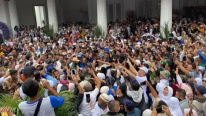 Jakarta - Ribuan massa menyambut kedatangan Gubernur DKI Jakarta, Anies Baswedan di Balai Kota DKI Jakarta, pada Minggu (16/10/2022).