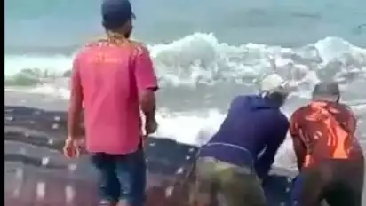 " Kalau dari panjangnya sekitar empat meter beratnya 2 ton karena sudah mati ya dagingnya kita potong untuk dibagikan ke warga sekitar pantai," tambah Iin.