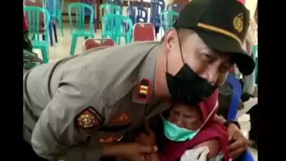 Agar vaksinasi bisa diberikan dan terpaksa Mbah Temi harus dipegang bahkan dipeluk agar tidak lari.Â