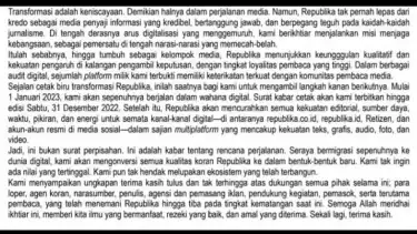 “Mulai 1 Januari 2023, kami akan sepenuhnya berjalan dalam wahana digital. Surat kabar cetak akan kami terbitkan hingga edisi Sabtu, 31 Desember 2022,” ujar Direktur PT. Republika Media Mandiri, Arys Hilman dalam sebuah keterangan yang diterima oleh tvOnenews pada Kamis (15/12/2022).