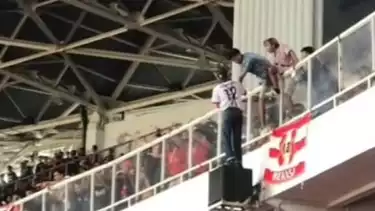 Di tengah Timnas Indonesia yang ditahan imbang oleh Thailand dengan 10 pemainnya saat bertanding, seorang penonton dengan nekat berdiri di atas pengeras suara yang terletak di tribun papan skor.