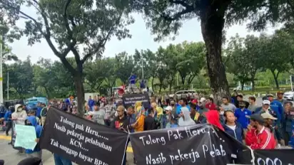 Jakarta, tvOnenews.com - Puluhan buruh melakukan unjuk rasa di depan Balai Kota DKI Jakarta. Mereka adalah korban penutupan Pelabuhan KCN Marunda.
