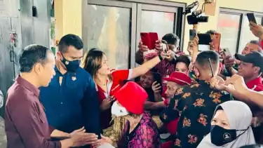 "Jokowi, Jokowi, Jokowi,” teriak masyarakat ketika Presiden berjalan di pasar membagikan bantuan sosial berupa bahan pokok.