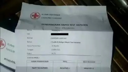 Kapolsek Tanjung Senang, Ipda Rosali, mengatakan usai dilakukan penelitian, ternyata surat rapid test antigen tersebut palsu.