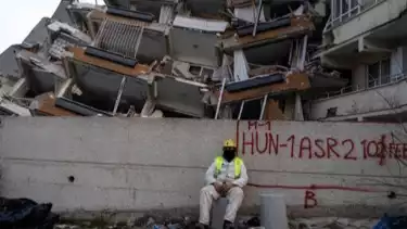 Seorang pekerja tim evakuasi berisitirahat di depan reruntuhan bangunan tempatnya melakukan proses evakuasi di Antakya, Turki.