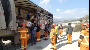 Tim misi kemanusian RI tengah menurunkan bantuan di Kota Antkyah, Hatay, Turki. Bantuan yang dibawa berupa makanan, air mineral dan Jenset.