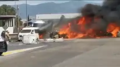 Dalam gambar yang dirilis oleh pasukan keamanan nasional Meksiko, terlihat sejumlah kendaraan terbakar akibat kecelakaan.
