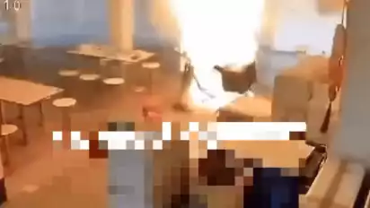 Pada akhirnya bagian sepeda motor listrik yang mengeluarkan asap itu tiba-tiba menyemburkan apinya mengarah ke sejumlah pria tersebut.