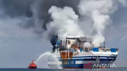 Euroferry Olympia berbendera Italia yang tengah berlayar dari Yunani menuju pelabuhan Brindisi di Italia terbakar pada Jumat pagi setelah meninggalkan pelabuhan Igoumenitsa.