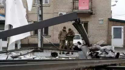 Polisi memeriksa sisa-sisa rudal yang jatuh di jalan di Ukraina timur, di Kyiv, Ukraina, (24/2/2022 2022)