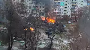 Kebakaran terlihat di area perumahan di Mariupol di tengah invasi Rusia ke Ukraina, 3 Maret 2022