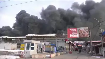 Kharkiv, Ukraina - Kepulan asap membumbung tinggi dari sebuah bangunan pasar setelah pasukan militer Rusia melanjutkan operasi militer khusus atau serangan militer di wilayah Kharkiv pada Kamis (17/3/2022) waktu setempat.