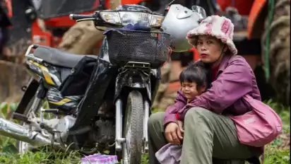 Ibunya yang menentang tas selempang, sembari duduk di atas tungkul kayu mencoba memenangkan kegelisahan anak perempuannya dengan memeluknya. Tetapi, tetap saja, anak itu menangis.