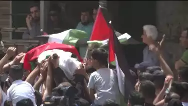 Ratusan warga Palestina mengiringi prosesi pemakaman seorang warga yang ditembak mati oleh militer Israel di desa Azzun, Tepi Barat.
