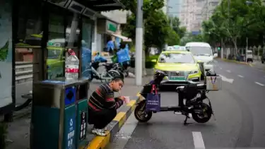 Seorang pekerja pengiriman barang menyikat gigi di pinggir jalan saat diberlakukan penguncian akibat COVID-19 di Shanghai, China, Kamis (12/5/2022).
