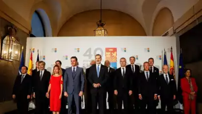 Sekjen NATO Jens Stoltenberg berpose dengan PM Spanyol Pedro Sanchez dan Raja Spanyol Felipe saat tiba untuk upacara memperingati bergabungnya Spanyol dengan NATO pada 1982 di Royal Theatre, Madrid, Spanyol, Senin (30/5/2022).
