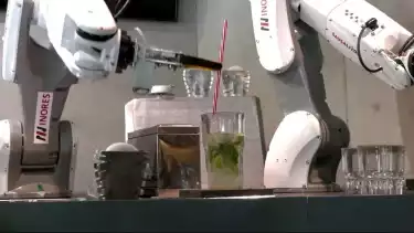 Robot bartender bertangan dua terlihat piawai meracik minuman bagi pengunjung di salah satu bar Sausalitos. Manajer Sausalitos, Christoph Heidt menuturkan pemanfaatan robot bartender lantaran mereka kekurangan pekerja usai pelonggaran pembatasan Covid-19.
