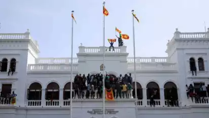 Pengunjuk rasa mengibarkan bendera Sri Lanka di atas gedung Kantor Perdana Menteri Ranil Wickremesinghe