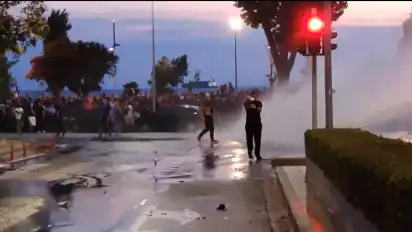 Sekitar 3500 massa demonstran yang menentang kebijakan wajib vaksin, melemparkan kembang api dan sejumlah benda lainnya ke arah polisi. Aksi massa demonstran tersebut kemudian dibalas dengan tembakan gas air mata serta meriam air ke oleh polisi.