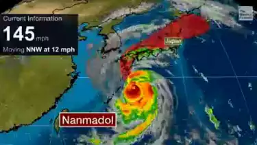 Mata Topan Nanmadol berada di selatan Kyushu pada Minggu pagi. Dan perlahan-lahan bergerak ke utara-utara-barat. Diperkirakan bergerak mendekati Kyushu atau bisa mendarat hingga Senin.