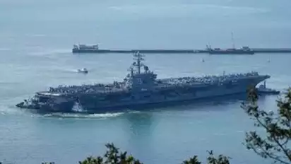 Diketahui, kapal perang induk USS Ronald Reagan serta kapal-kapal tempur lainnya berlabuh di pangkalan angkatan laut di kota pelabuhan Busan, Korsel Selatan.