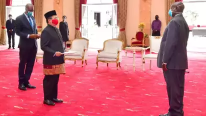 Duta Besar Indonesia untuk Uganda, Dr. Mohamad Hery Saripudin, serahkan letter of credentials dari Presiden Jokowi ke Presiden Uganda terpilih, Yoweri Kaguta Museveni.