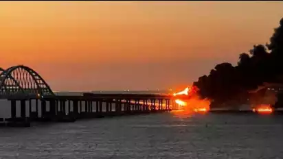 Sejumlah foto menunjukkan kobaran api di tanki minyak yang menempel dengan Jembatab Kerch, yang berisi rel dan jalan raya menghubungkan Krimea dengan sistem transportasi Rusia.Â