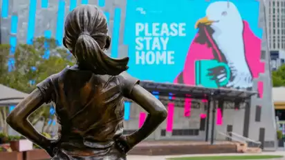 Dokumentasi - Patung Gadis Fearless melihat tanda "Tolong Tetap di Rumah"