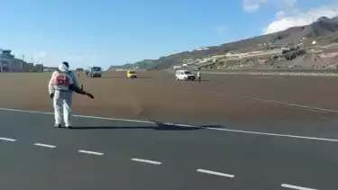 La Palma - Petugas bandara melakukan pembersihan abu vulkanik yang menyelimuti area parkir pesawat di bandara La Palma pada Sabtu (25/9) pagi waktu setempat.
