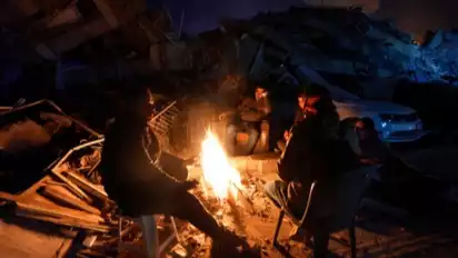 Warga Turki menyalakan api unggun di sekitar reruntuhan akibat gempa di Antakya, Turki.