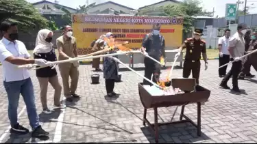 "Barang bukti dimusnahkan didasarkan pada putusan Pengadilan Negeri Mojokerto yang telah mempunyai kekuatan hukum tetap. Paling banyak barang bukti narkoba, diantaranya sabu-sabu seberat 400 gram, pil doble L 9429 butir, ganja seberat 1388 gram, pil ekstasi 3 butir, 14 unit handphone dan 27 timbangan elektronik" jelas Heri.