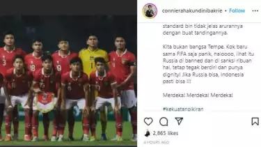"Kita bukan bangsa tempe. Kok baru sama FIFA saja panik, haloooo, lihat itu Russia di-banned dan disanksi ribuan hal, tetap tegak berdiri dan punya dignity! Jika Russia bisa, Indonesia pasti bisa!" tulis Connie, dikutip dari Instagram @connierahkundinibakrie, Kamis (30/3/2023).