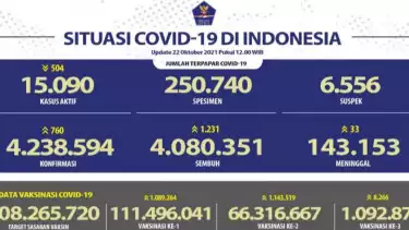 Dengan demikian, maka jumlah akumulatif warga yang terinfeksi virus corona tipe SARS-CoV-2 sejak awal pandemi Maret 2020 sampai saat ini sebanyak 4.238.594 kasus Covid-19 di Indonesia, dengan 4.080.351 orang pulih dan 143.153 orang meninggal dunia. Tambahan kasus Covid-19 pada Jumat (22/10) paling banyak terjadi di Jawa Barat, yakni sebanyak 133 orang, diikuti Jawa Tengah (89 orang), dan DKI Jakarta (83 orang).