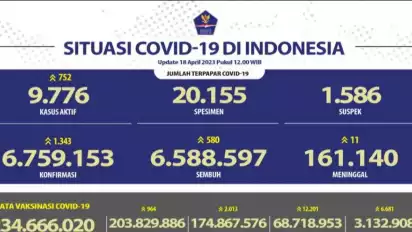 Jakarta, tvOnenews.com - Satuan Tugas (Satgas) Penanganan COVID-19 melaporkan penambahan kasus harian COVID-19 adalah sebanyak 1.343 orang hingga Selasa (18/4/2023) pukul 12.00 WIB.