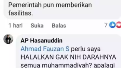"Perlu saya halalkan gak neh darah darahnya semua muhammadiyah? apalagi muhammadiyah yang disusupi Hizbut Tahrir melalui agenda Kalender Islam Global dari Gema Pembebasan? banyak bacot emang, sini saya bunuh kalian satu-satu. Silakan laporkan komen saya dengan ancaman pasal pembunuhan saya siap dipenjara. Saya capek liat pergaduhan kalian," tulisnya.