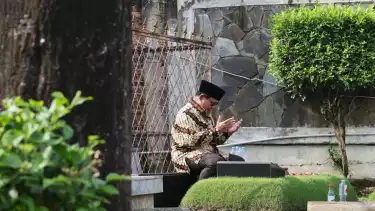 Prabowo berziarah ke makam ayahnya pada pagi hari. Ia datang seorang diri mengenakan pakaian batik dan kopiah hitam.