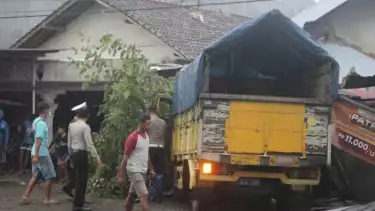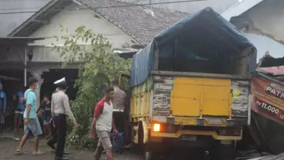 Blitar, Jawa Timur - Kecelakaan tunggal terjadi di Desa Tuliskriyo, Kecamatan Sanankulon, Kabupaten Blitar, Rabu (27/10/2021). Truk dengan nomor polisi AG 9017 PH yang dikemudikan Jailani, warga Madiun, tergelincir menabrak rumah warga. Kanit Laka Lantas Polres Blitar Kota, Ipda Ahmad mengatakan, kecelakaan terjadi saat kendaraan truk melaju dari arah barat. Saat melintas di Jalan Raya Tuliskriyo, tiba-tiba ban truk selip dan truk hilang kendali.