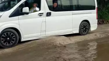 "Mundur pak, mundur dulu. Sini pak lewat sini, waduh mobil bagus lewat lumpur, hahaha," ucap warga yang merekam kejadian tersebut sembari tertawa.