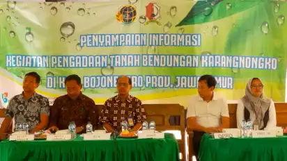 Bojonegoro, tvOnenews.com - Proses pembangunan Bendungan Karangnongko di Desa Ngelo Kecamatan Margomulyo, Jawa Timur, memasuki tahapan pembebasan lahan. Ratusan warga hadir mengikuti kegiatan sosialisasi pembebasan lahan yang dilaksanakan oleh Badan Pertanahan Negara (BPN) Bojonegoro, Kamis.