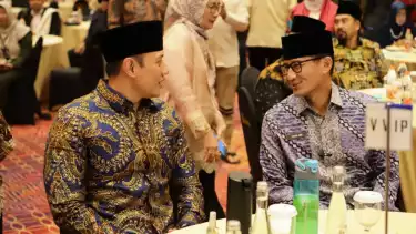 Jakarta, tvOnenews.com - Menteri Pariwisata dan Ekonomi Kreatif (Menparekraf) Sandiaga Uno dan Ketua Umum Partai Demokrat Agus Harimurti Yudhoyono (AHY) terlihat akrab dalam acara halal bihalal Majelis Ulama Indonesia (MUI).