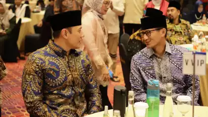 Pantauan tvOnenews, keduanya duduk bersebelahan dalam satu meja. Sandi dan AHY juga sempat bersalaman ketika bertemu. Diketahui, acara ini digelar di Hotel Bidakara, Jakarta Selatan, Kamis (18/5/2023) malam.