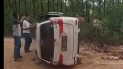 “Ini mobil tim kita, kebalik. Mudah-mudahan semuanya sehat, semuanya enggak apa-apa. Cuma mobilnya sempat kebalik," kata seseorang yang merekam video tersebut.
