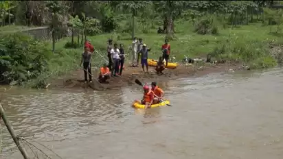 Dengan menggunakan dua perahu Kano, polisi menyisir sungai yang digunakan sebagai rute perjalanan susur sungai oleh siswa termasuk mengukur kedalaman sungai di lokasi menyebrangnya 25 siswa Mts.