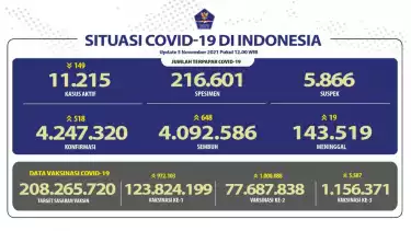 Jakarta - Satuan Tugas (Satgas) Penanganan Covid-19 melaporkan penduduk Indonesia yang telah menerima vaksin dosis pertama hingga Jumat (5/11) pukul 12.00 WIB mencapai 123.824.199 jiwa.