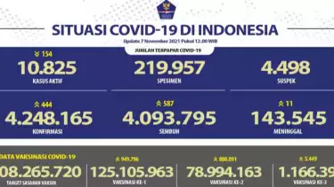 Walaupun demikian, jumlah orang yang terkonfirmasi terkena virus Covid tipe SARS-CoV-2 terus mengalami penambahan sebanyak 444 kasus, sehingga saat ini terdapat 4.248.165 orang yang positif Covid-19 di Tanah Air. Pada kasus kematian akibat Covid-19, tercatat kembali mengalami penambahan sebanyak 11 jiwa, sehingga jumlah pasien yang meninggal mencapai 143.545 jiwa.